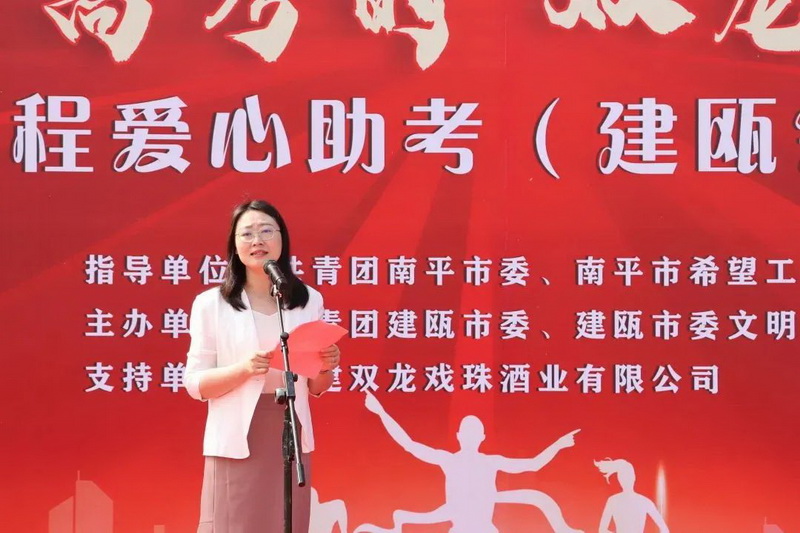 為給考生提供及時(shí)、周到的服務(wù),讓考生安心赴考,6月5日,由南平團(tuán)市委指導(dǎo),建甌團(tuán)市委、建甌市委文明辦、建甌市教育局聯(lián)合福建雙龍戲珠酒業(yè)有限公司舉辦“圓夢(mèng)高考時(shí) 雙龍助騰飛”南平市希望工程愛心助考(建甌會(huì)場(chǎng))集中宣傳活動(dòng)在建甌市博物館新館前廣場(chǎng)順利舉行。南平團(tuán)市委副書記王婷,建甌市委常委、組織部部長(zhǎng)胡宗捷,建甌市委文明辦主任虞樂雄,建甌市教育局黨組書記、局長(zhǎng)何華生,共青團(tuán)建甌市委書記祝菁等單位主要領(lǐng)導(dǎo),福建雙龍戲珠酒業(yè)有限公司副總經(jīng)理吳小如出席活動(dòng),建甌市青年志愿者和愛心司機(jī)代表約60余人參加本次活動(dòng)。